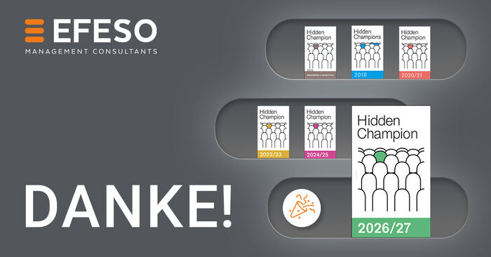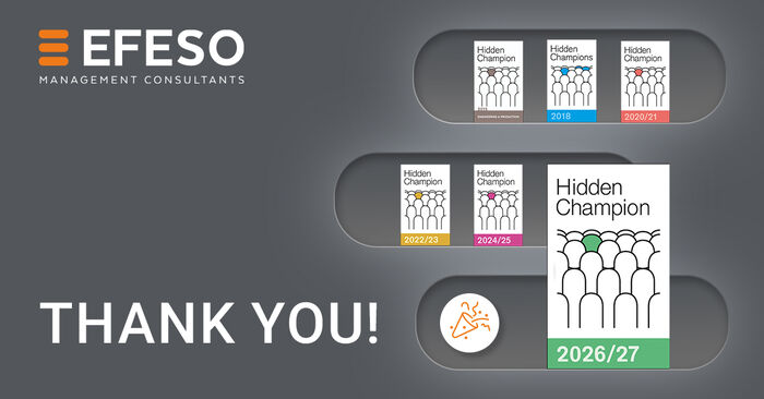 We are delighted to have once again been ranked as Germany's leading consultancy in the "Engineering & Production" discipline in the industry survey "Hidden Champions of the Consulting Market." For the sixth consecutive year, study participants awarded EFESO with the renowned quality seal. With the 2026/27 edition of the study, we have maintained our first-place ranking in this consulting discipline since 2015.