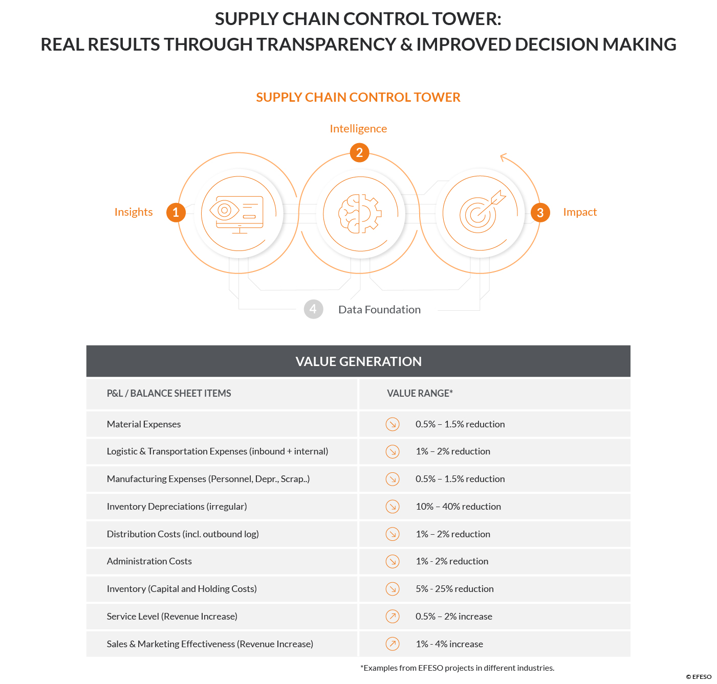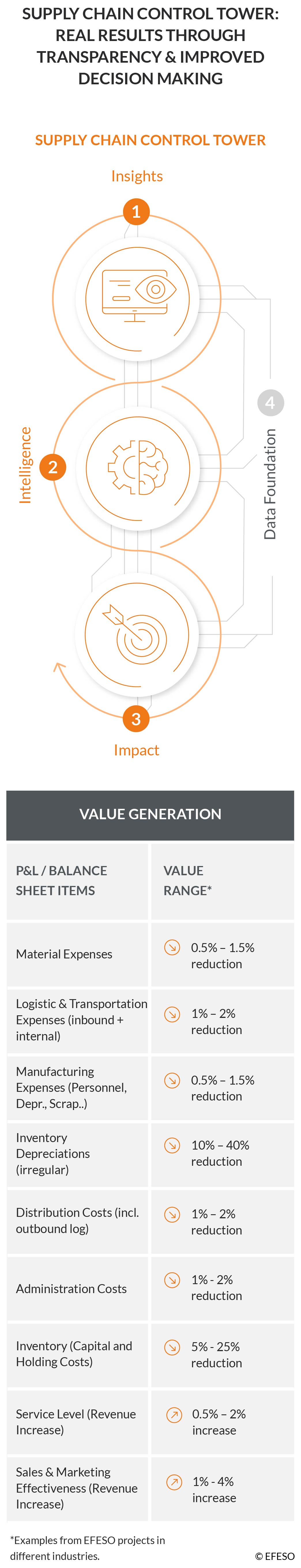 - Companies operating without effective risk management typically experience significant margin losses (often referred to as a “burning platform”). In addition to the benefits outlined above, the Supply Chain Control Tower enables KPI-relevant improvements such as lower transportation costs, reduced reliance on air freight, lower relocation costs, and optimized inventory levels.