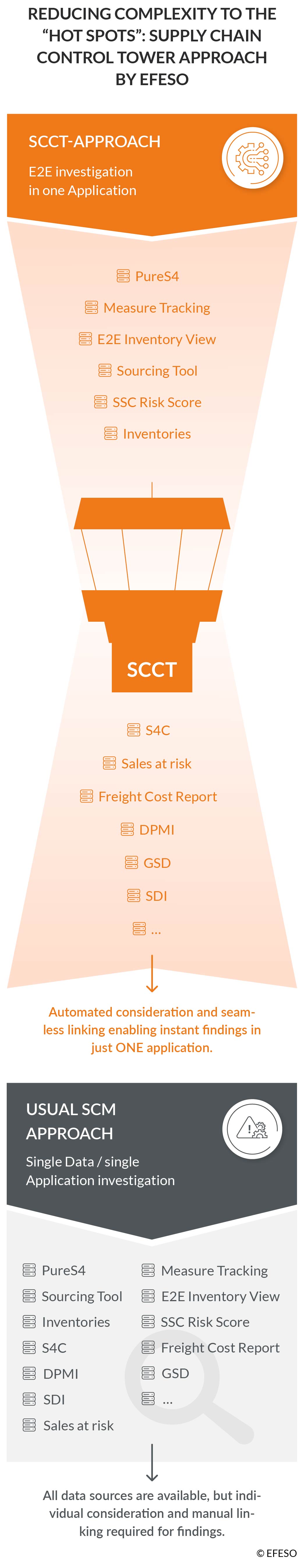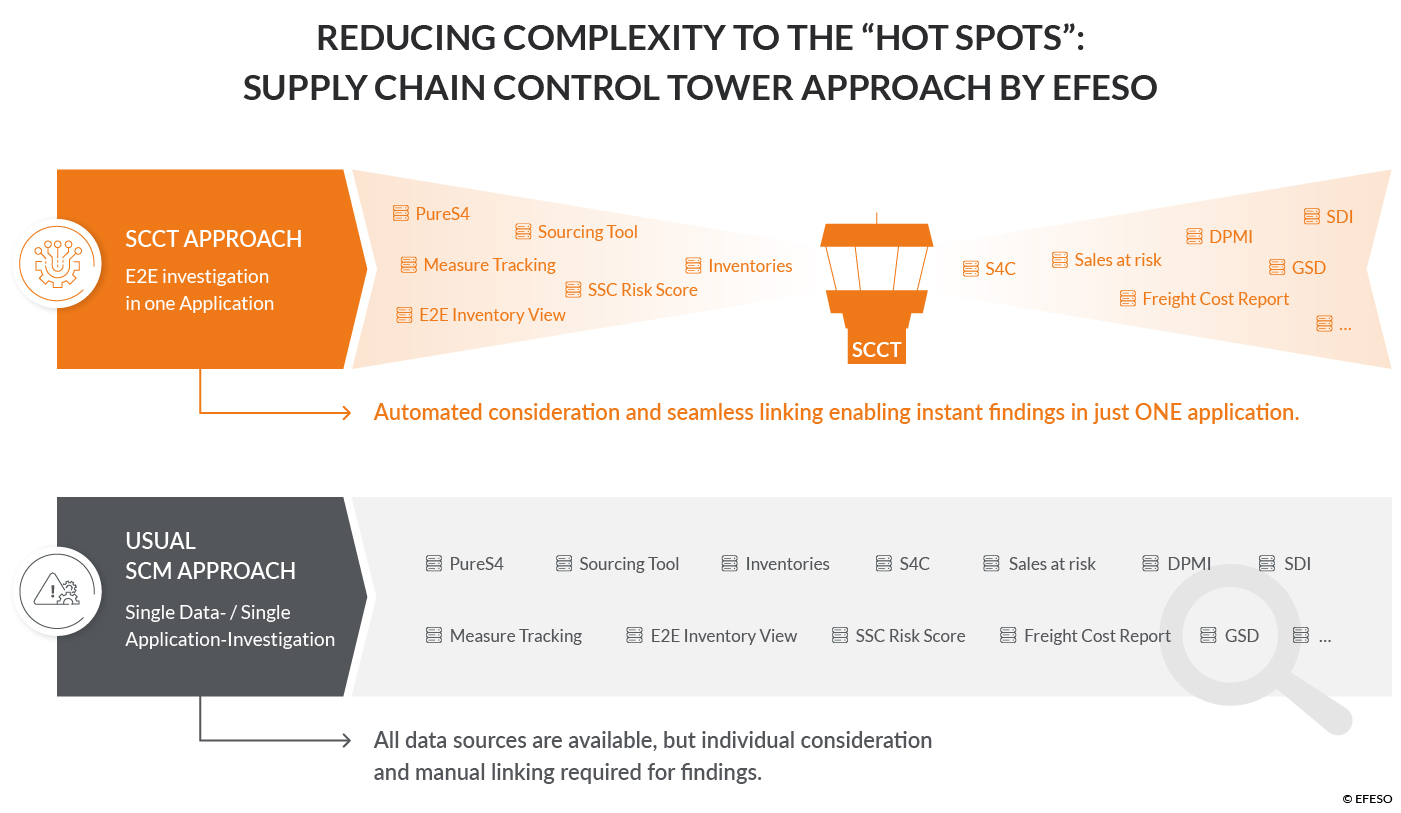 As a result, management identified “transparency” as a critical success factor. Based on positive experiences from previous SCM projects, the company engaged EFESO to enable immediate visibility into which products and customers are affected by disruptions within the value chain network. The focus was to establish a Supply Chain Control Tower (SCCT) as a central technology within the SCM and procurement organization within four months—and thus quickly realize the following benefits:
