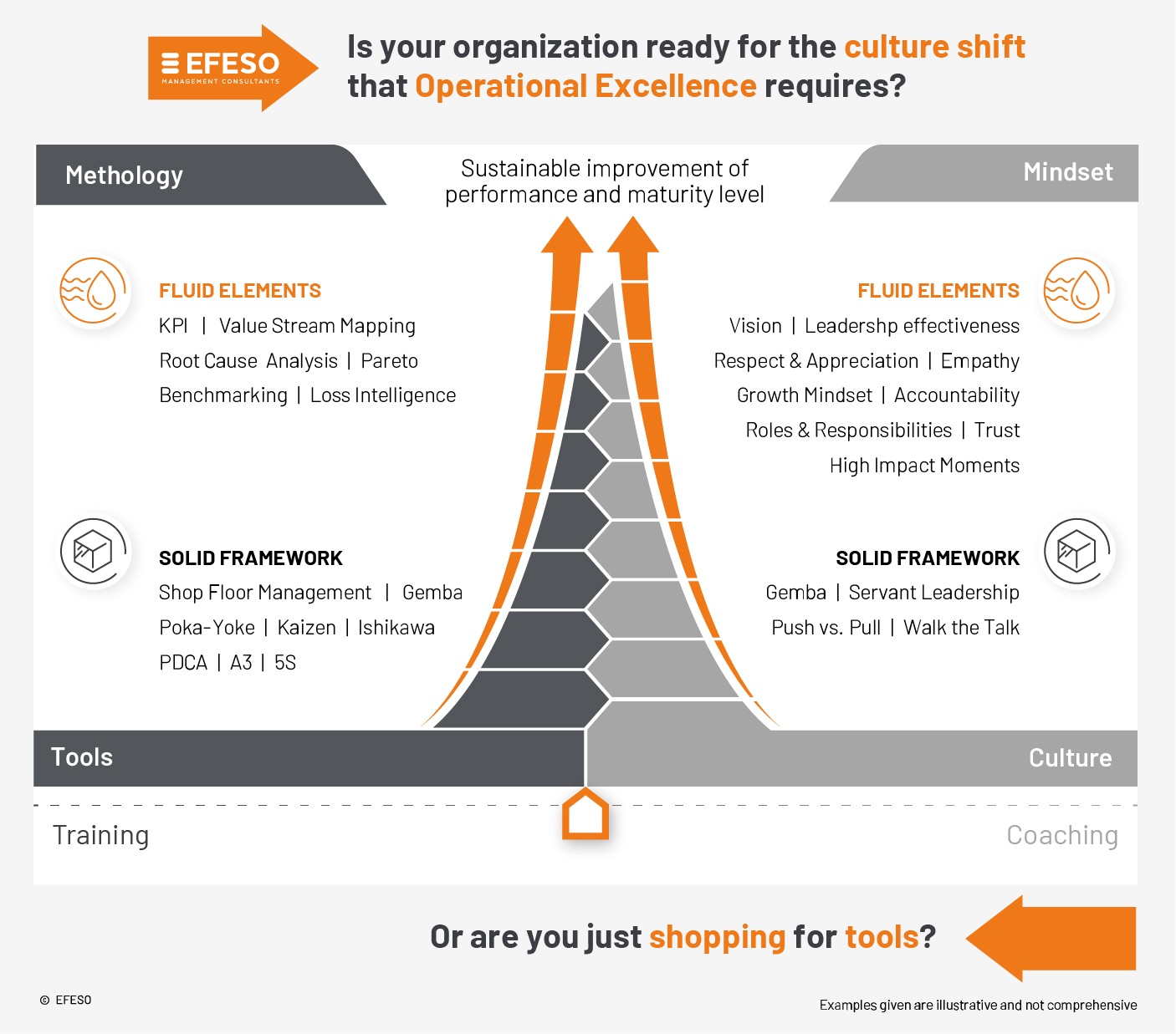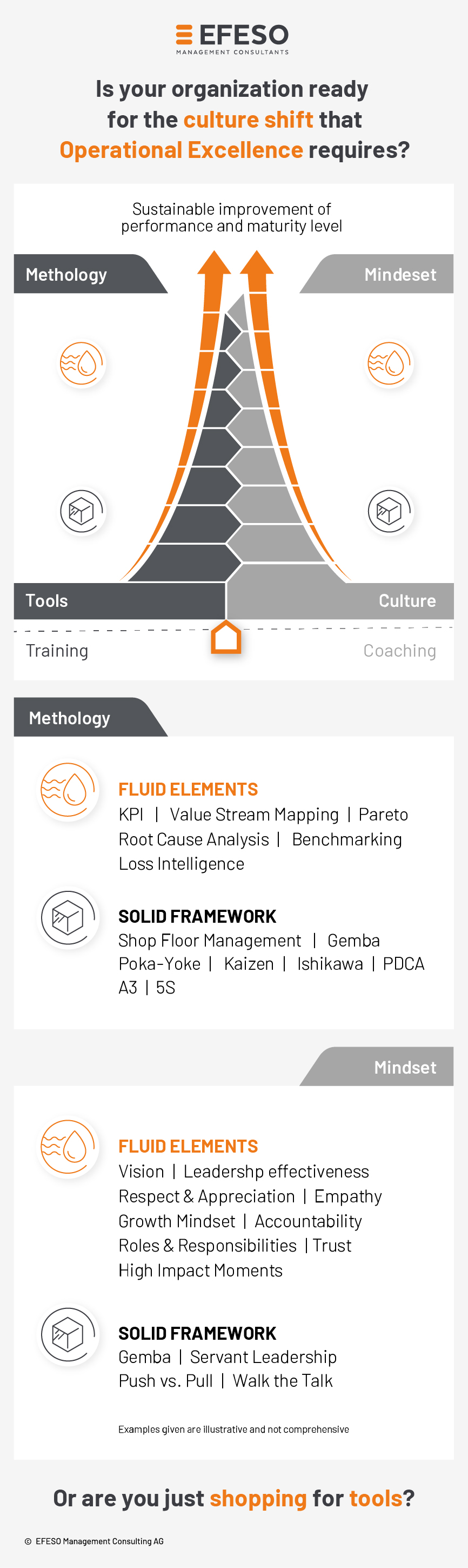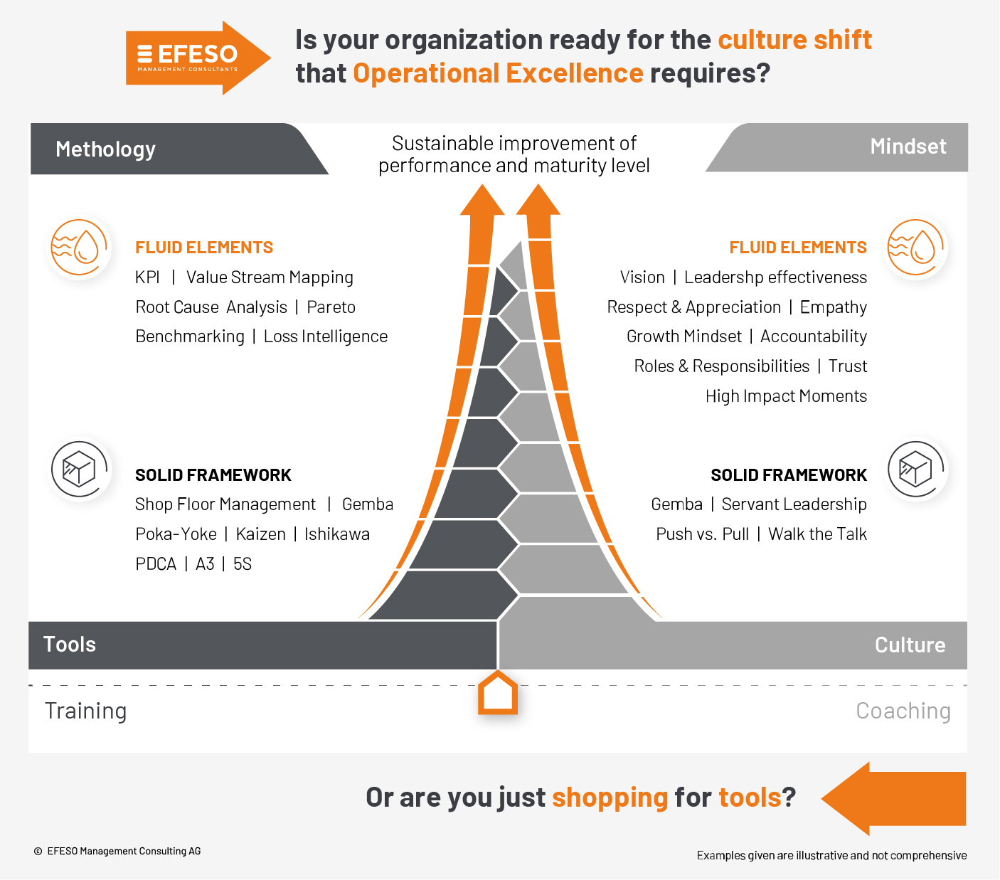 Operational Excellence requires more than methods (competence) – the combination and balancing with leadership and cultural aspects is crucial. Only when employees understand the underlying principles, take responsibility and anchor continuous improvement in their daily work do methods and tools unfold their full impact.